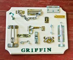 Kolāžas bilde ar durtiņām un slēdžiem. Lai mazie pirksti izdomā, kā atmūķēt durvis.